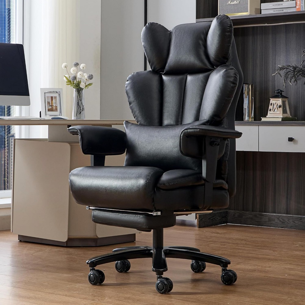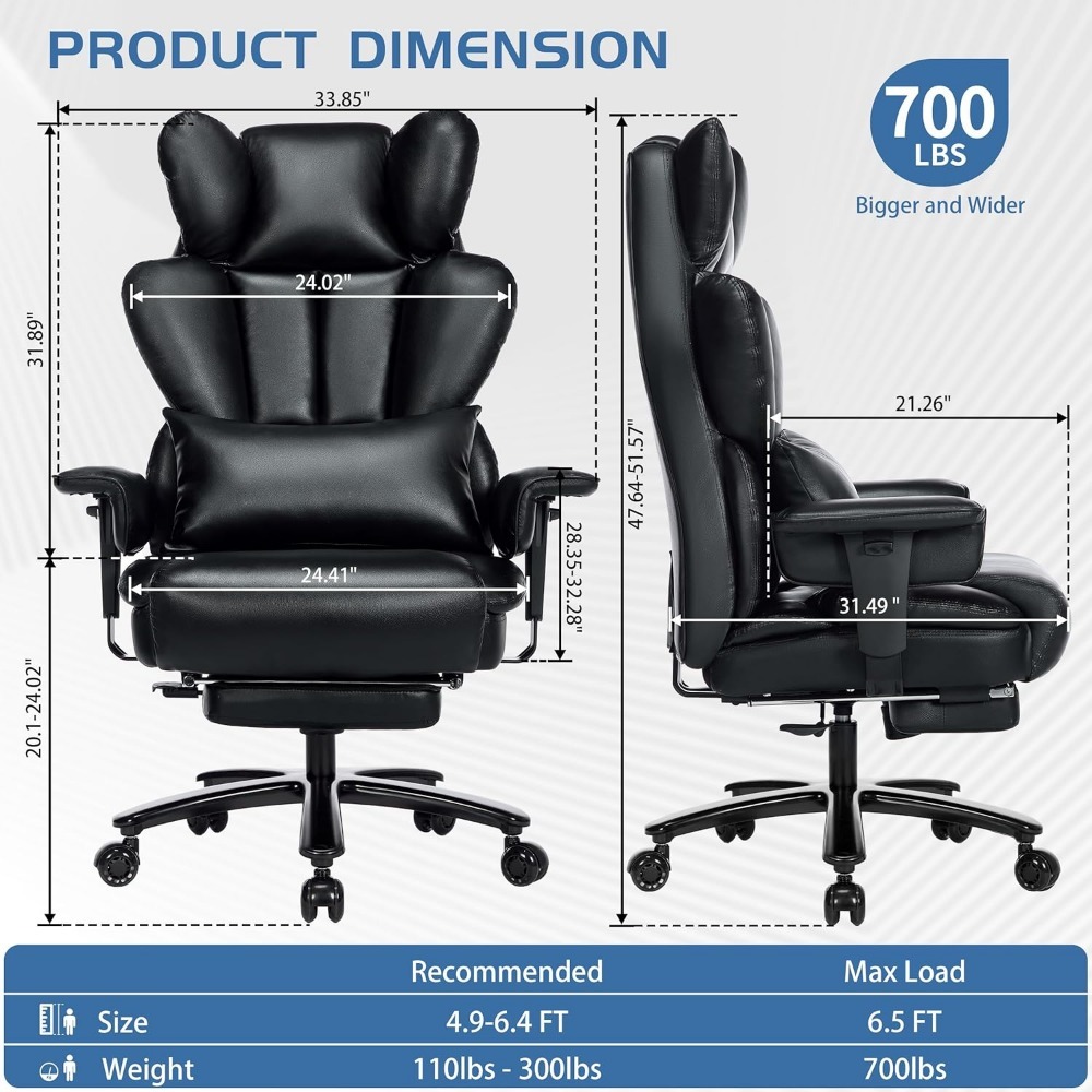 Silla de oficina grande y alta de 700 libras con reposapiés y almohada lumbar ajustable, silla ejecutiva grande y resistente, asiento ancho, ergonómica.
